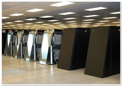 The system on chip approach used in the Blue Gene/L project integrates two processors, cache (Level 2 and Level 3), internode networks (torus, tree, and global barrier networks), JTAG and Gigabit Ethernet links on the same die. By using the embedded DRAM, we have enlarged the on-chip Level 3 cache to four MB, four to eight times larger than competitive cache’s made of SRAM and greatly enhancing the amount of realized performance of the processor. By integrating the inter-node networks, we can take advantage of the same generation technology, i.e., these networks scale with chip frequency. Furthermore, the off-chip drivers and receivers can be optimized to consume less power than those of industry standard networks. Figure 2 is a photograph of multi-rows of the Blue Gene/L system. The first two rows have their black covers on, whereas the remaining rows are uncovered.